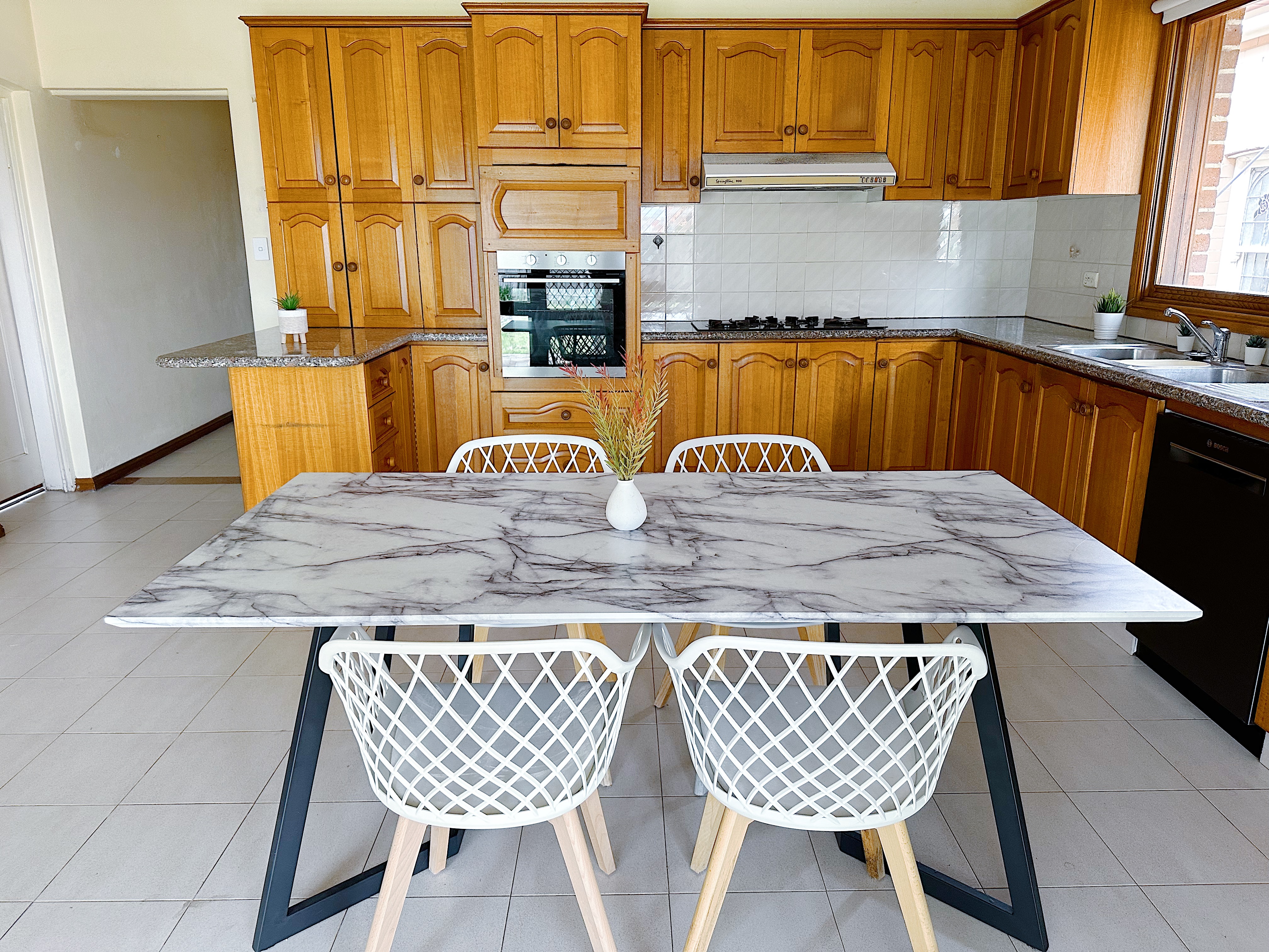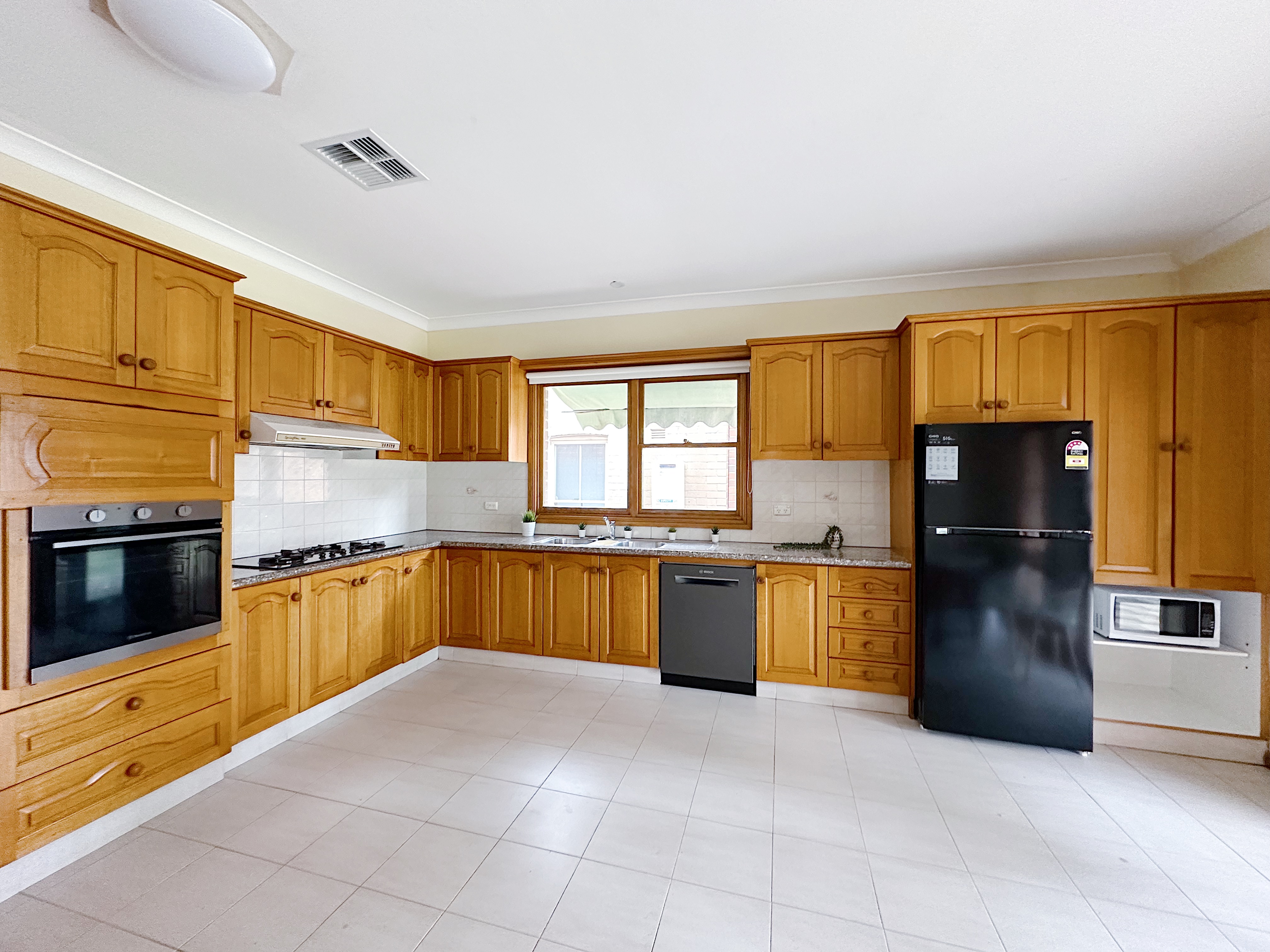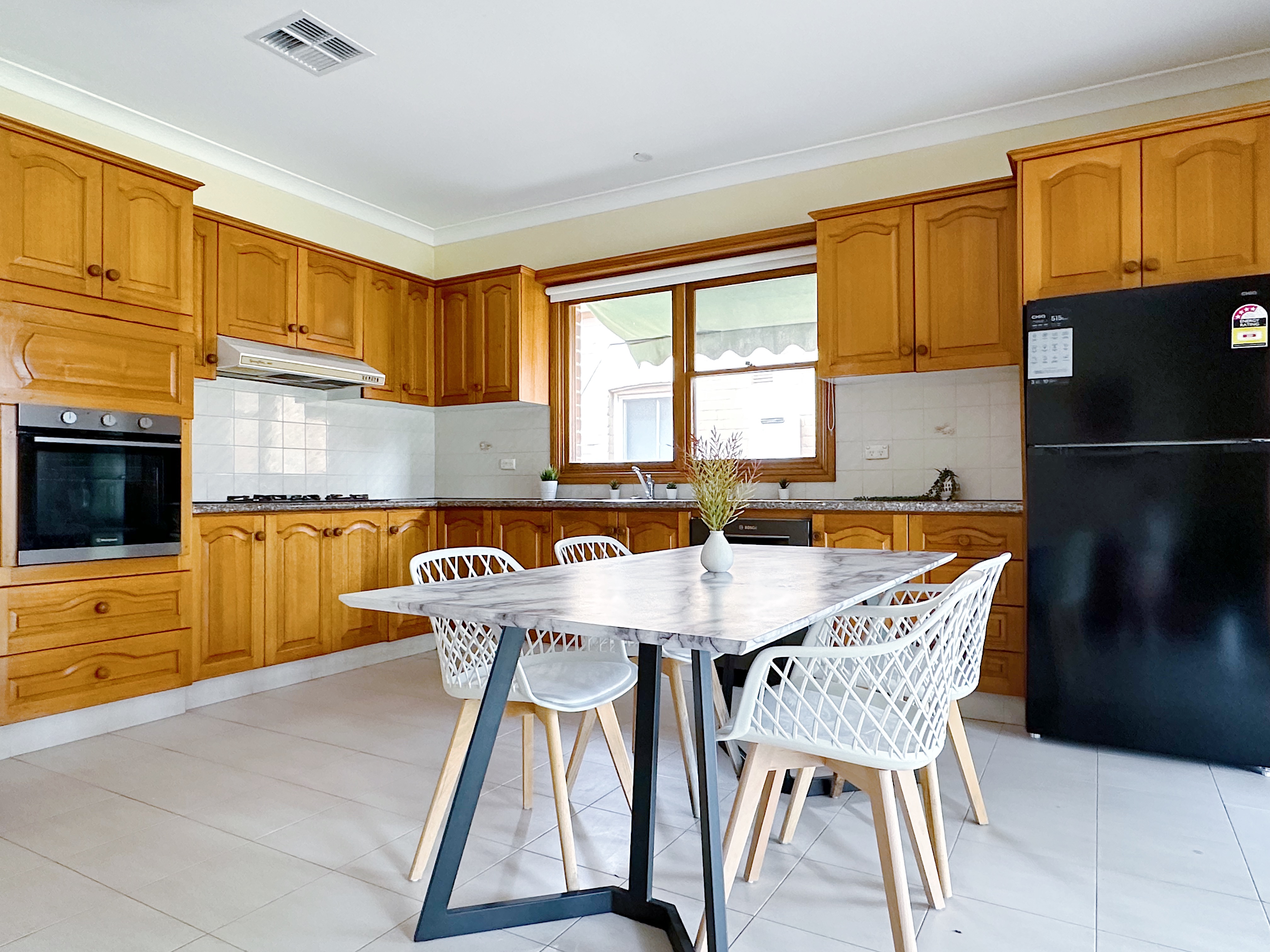 • Spacious kitchen featuring marble bench top and ample cupboard space, equipped with top-notch appliances for culinary enthusiasts, including oven, dishwasher, microwave, and a spacious 515L Fridge.