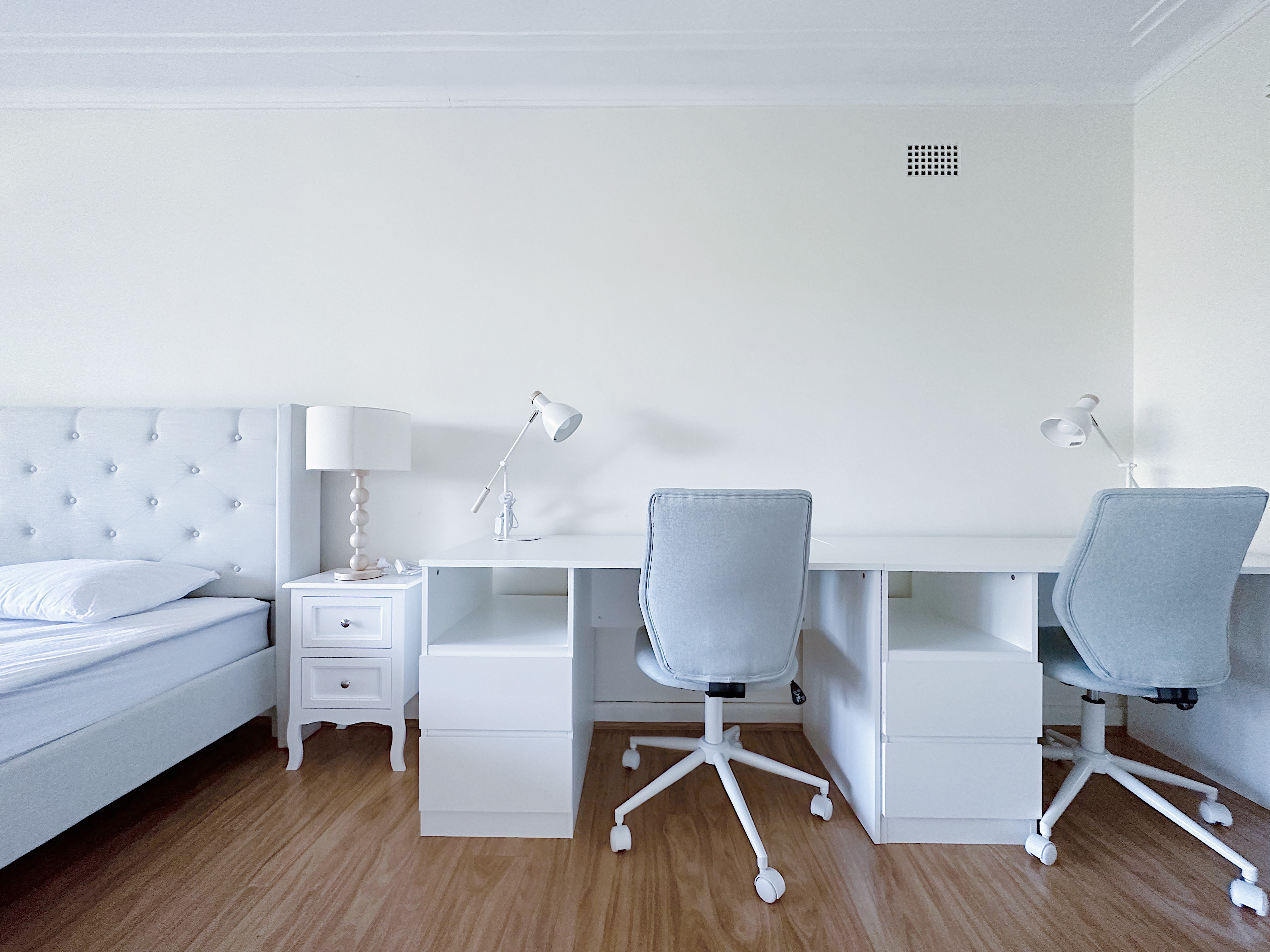 • Two desks with drawers, perfect for two individuals to work or study comfortably.
