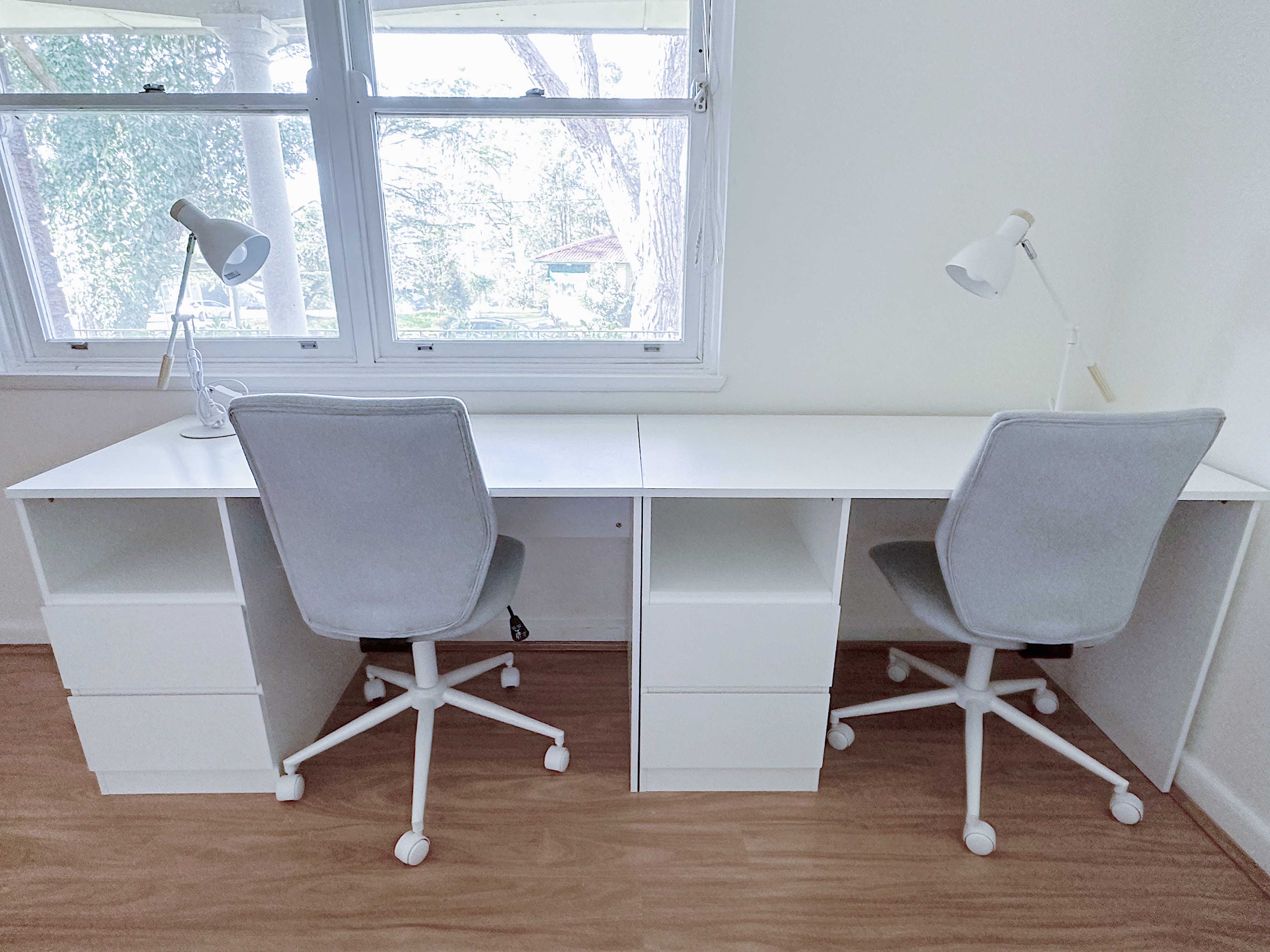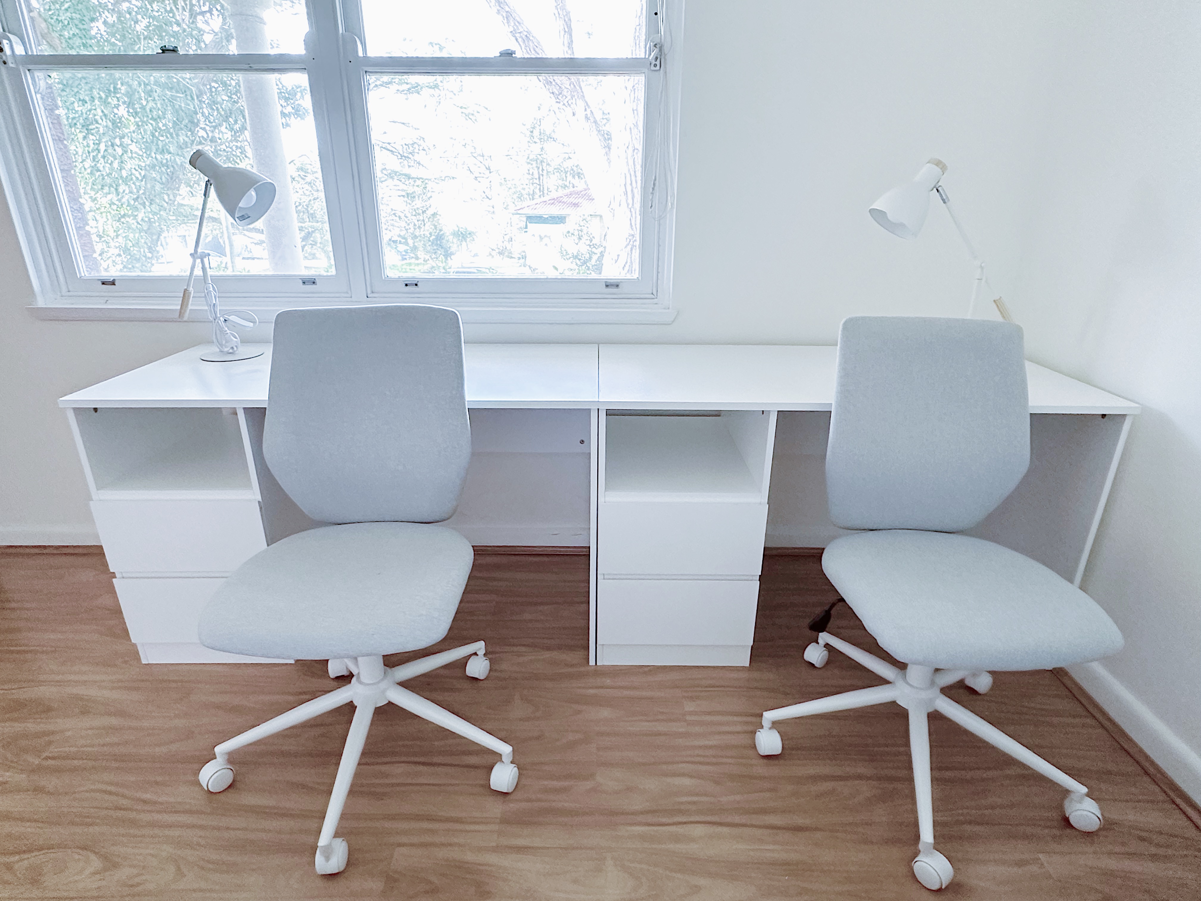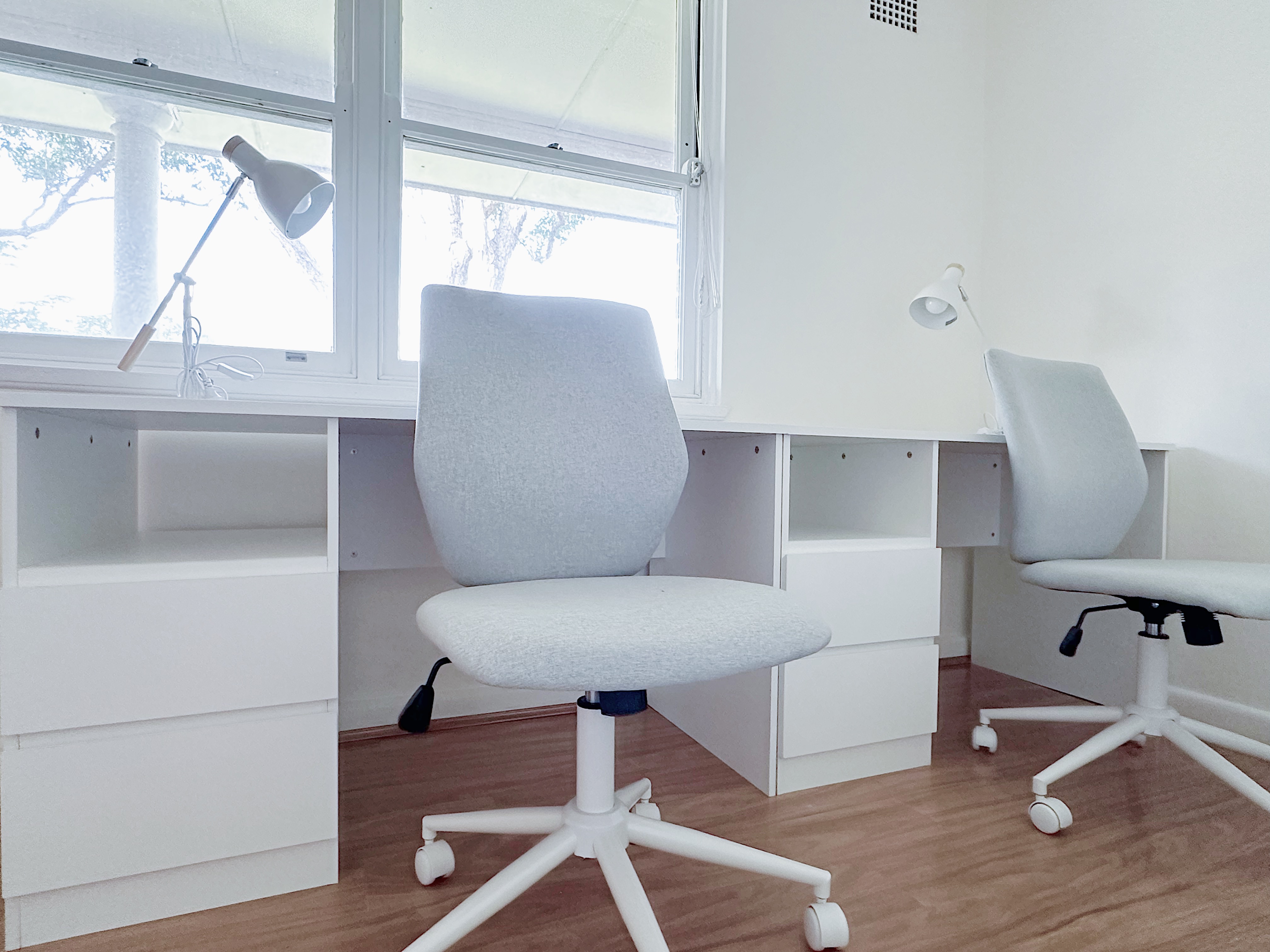 • Two desks with drawers and two swivel chairs, facilitating a comfortable workspace for two occupants