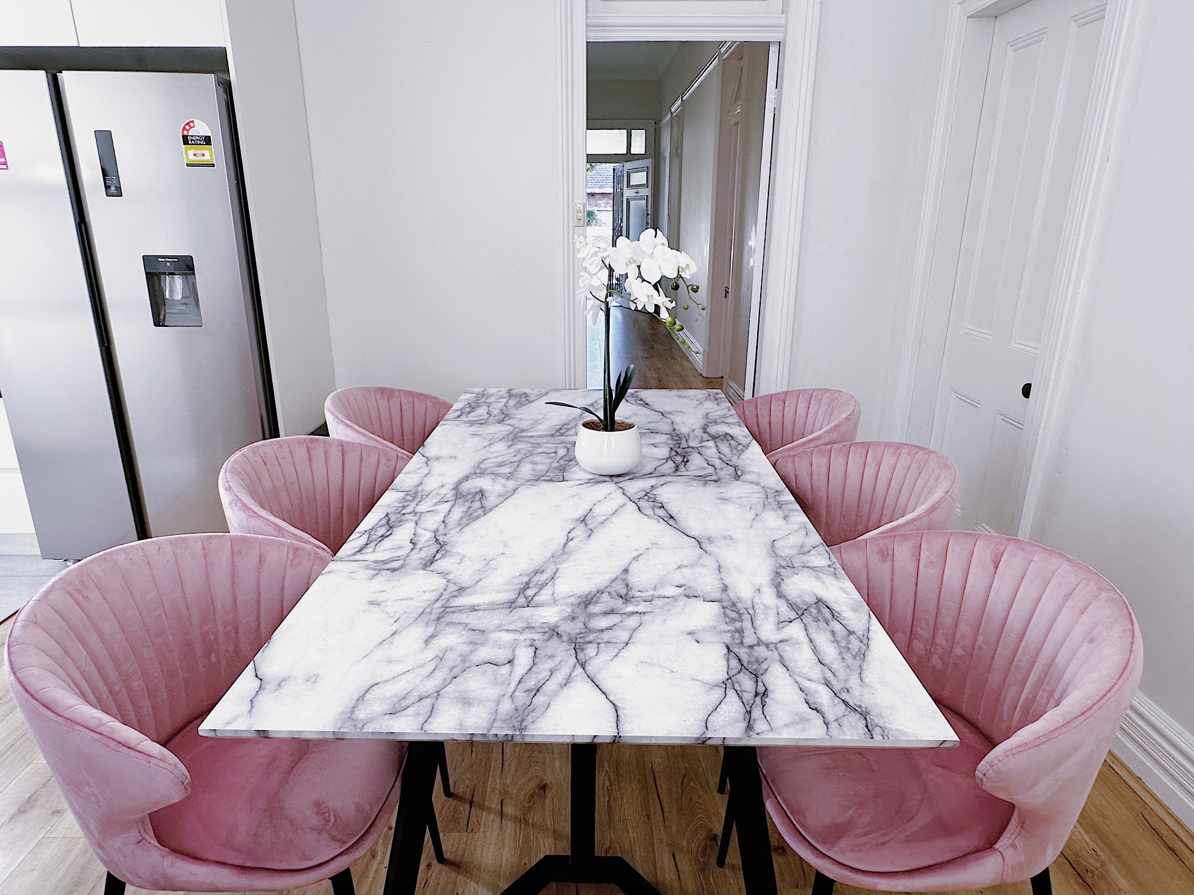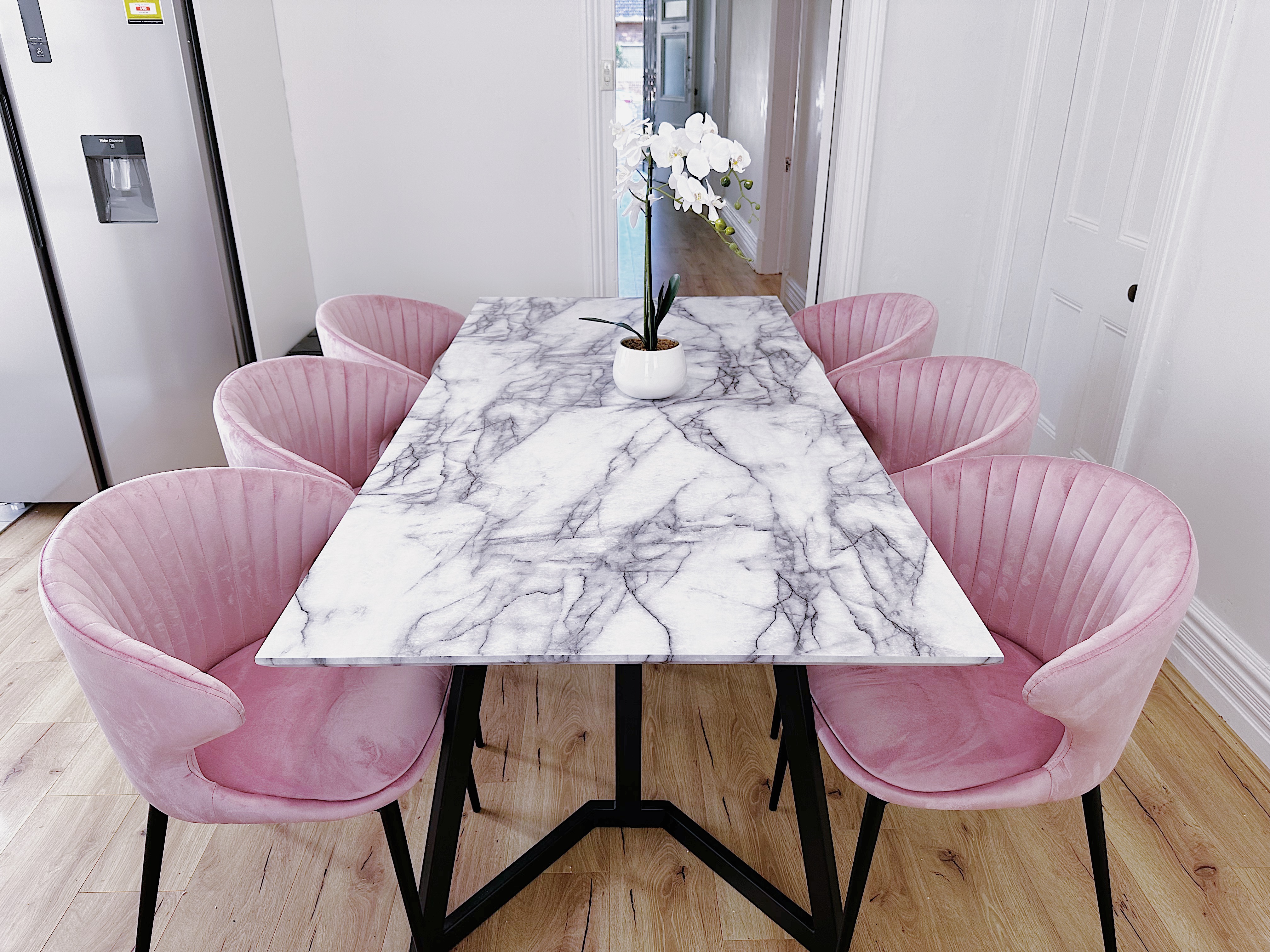 • Elegant dining set features a beautiful Scandinavian marble dining table accompanied by luxurious velvet chairs set