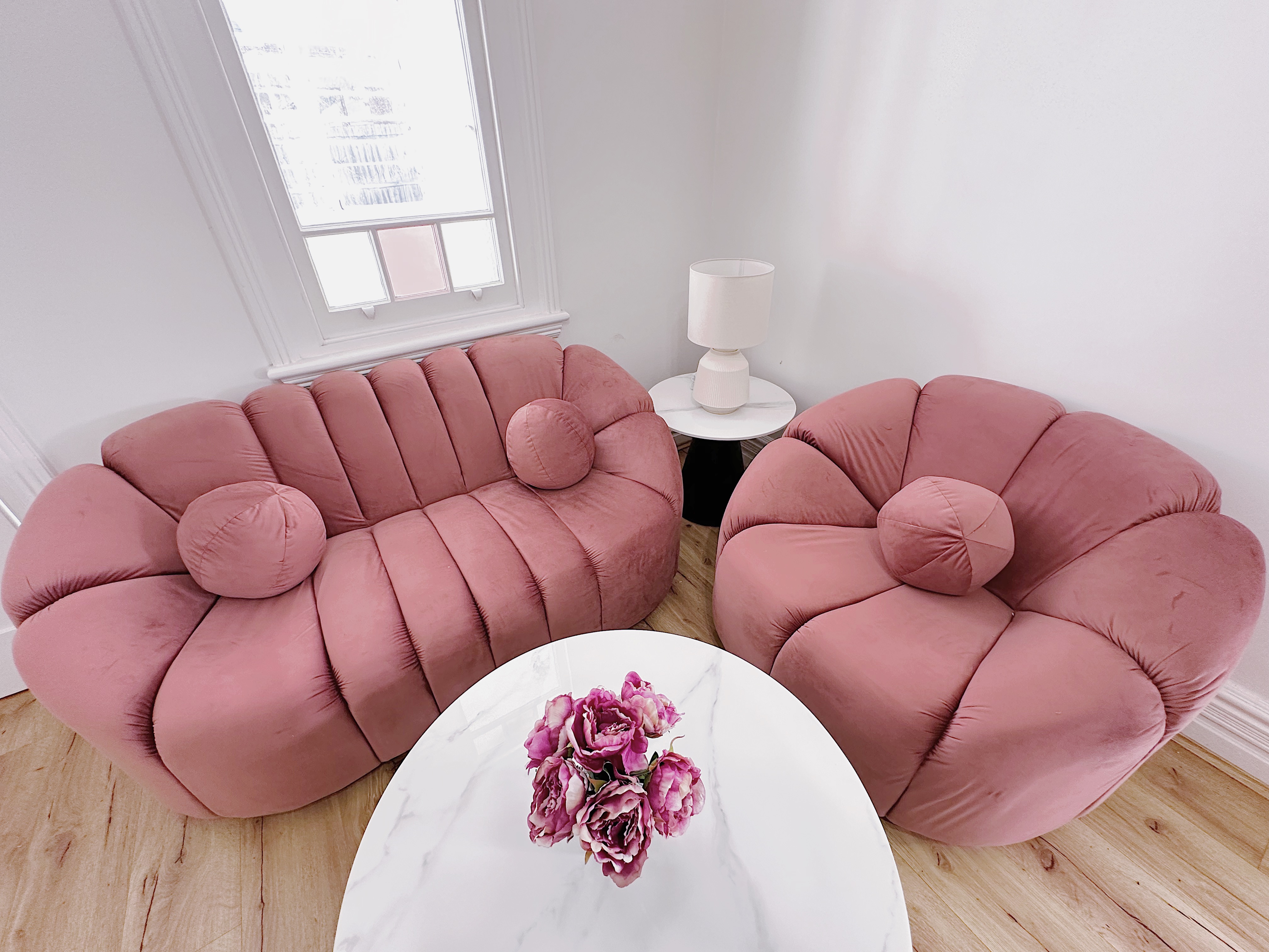 • Stylish living room adorned with a lavish velvet sofa set and a ceramic porcelain coffee table