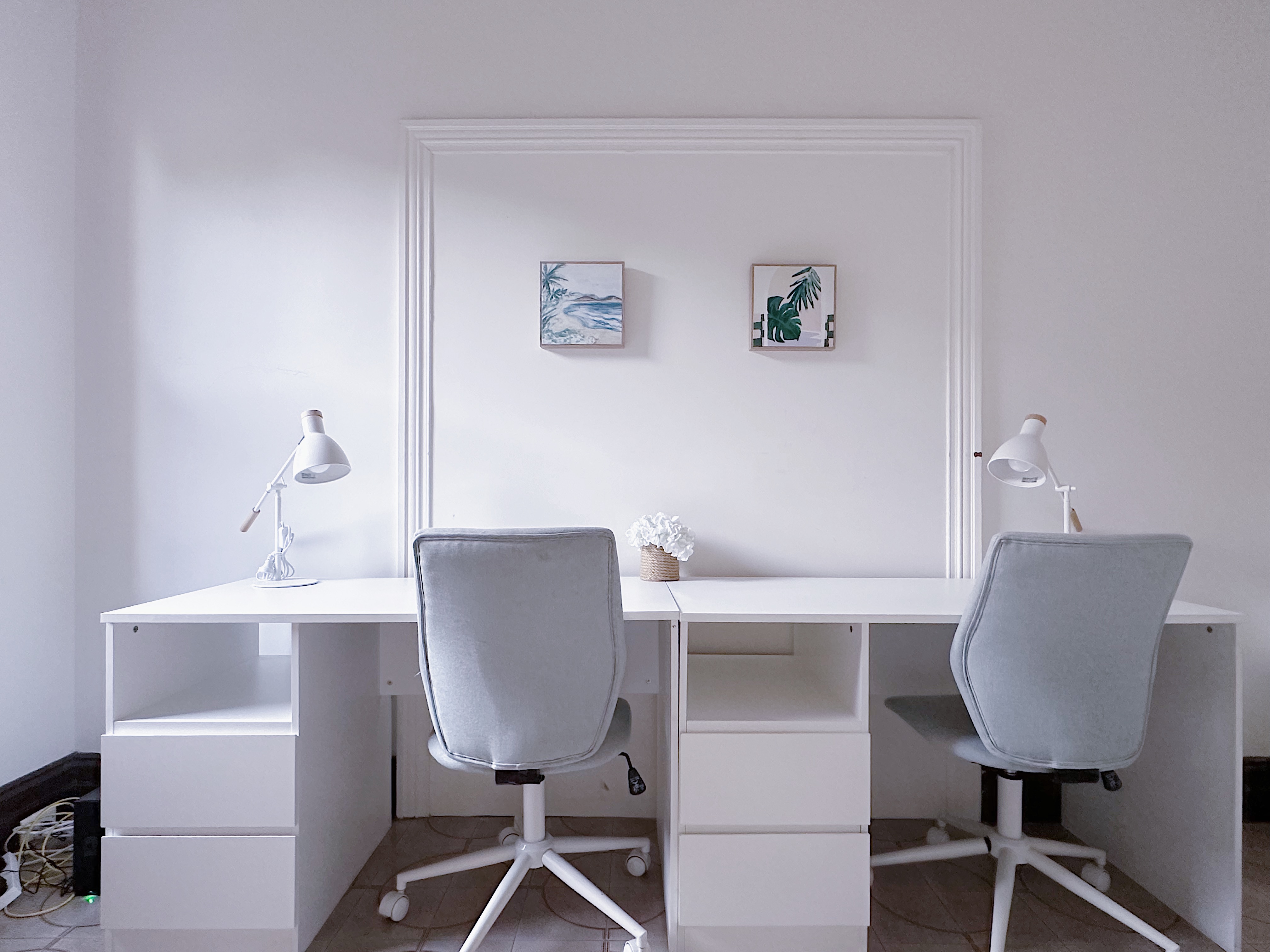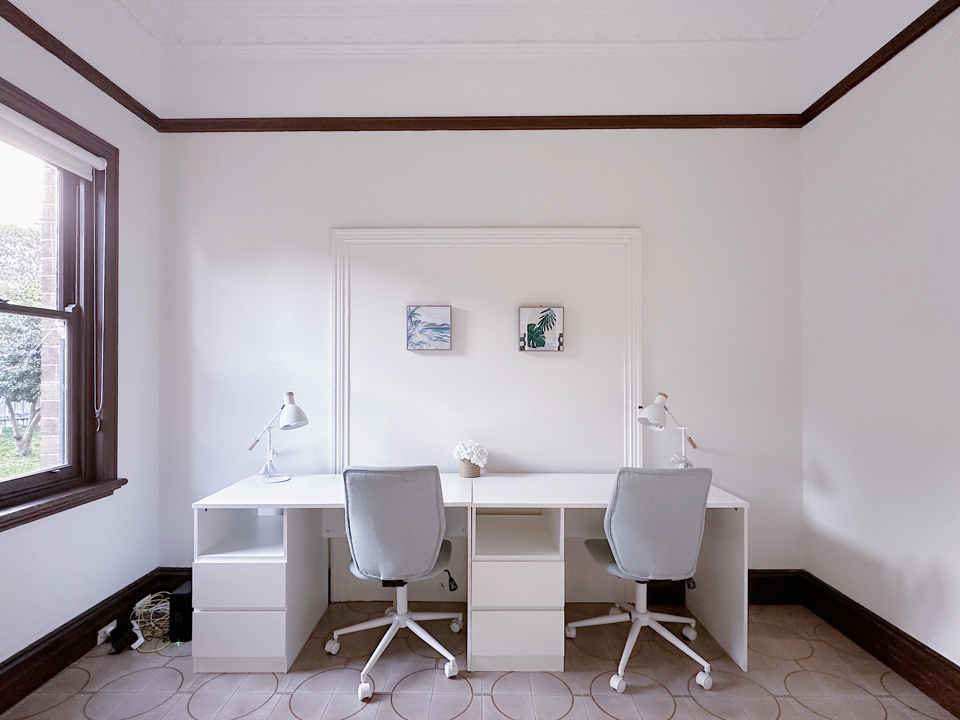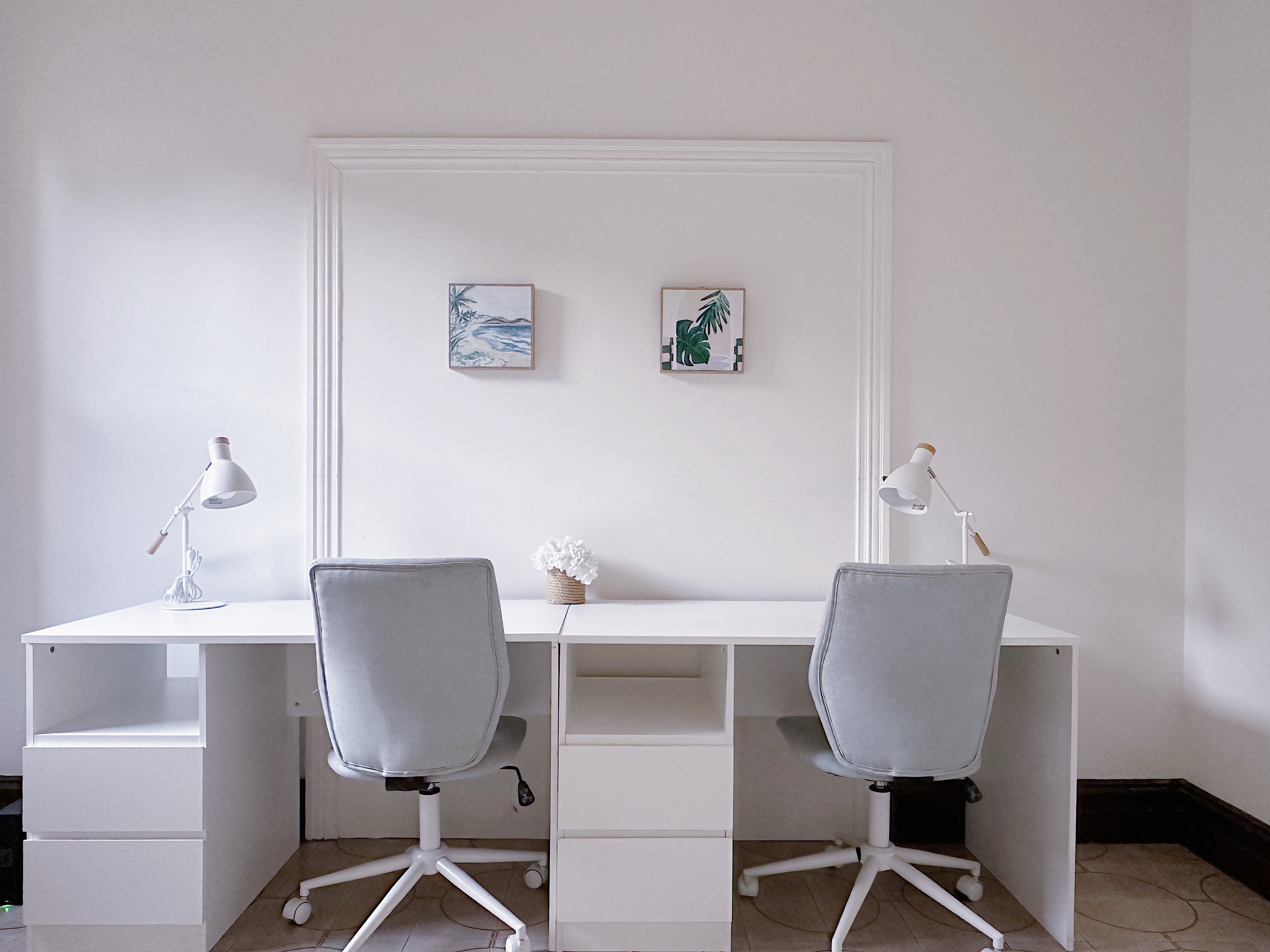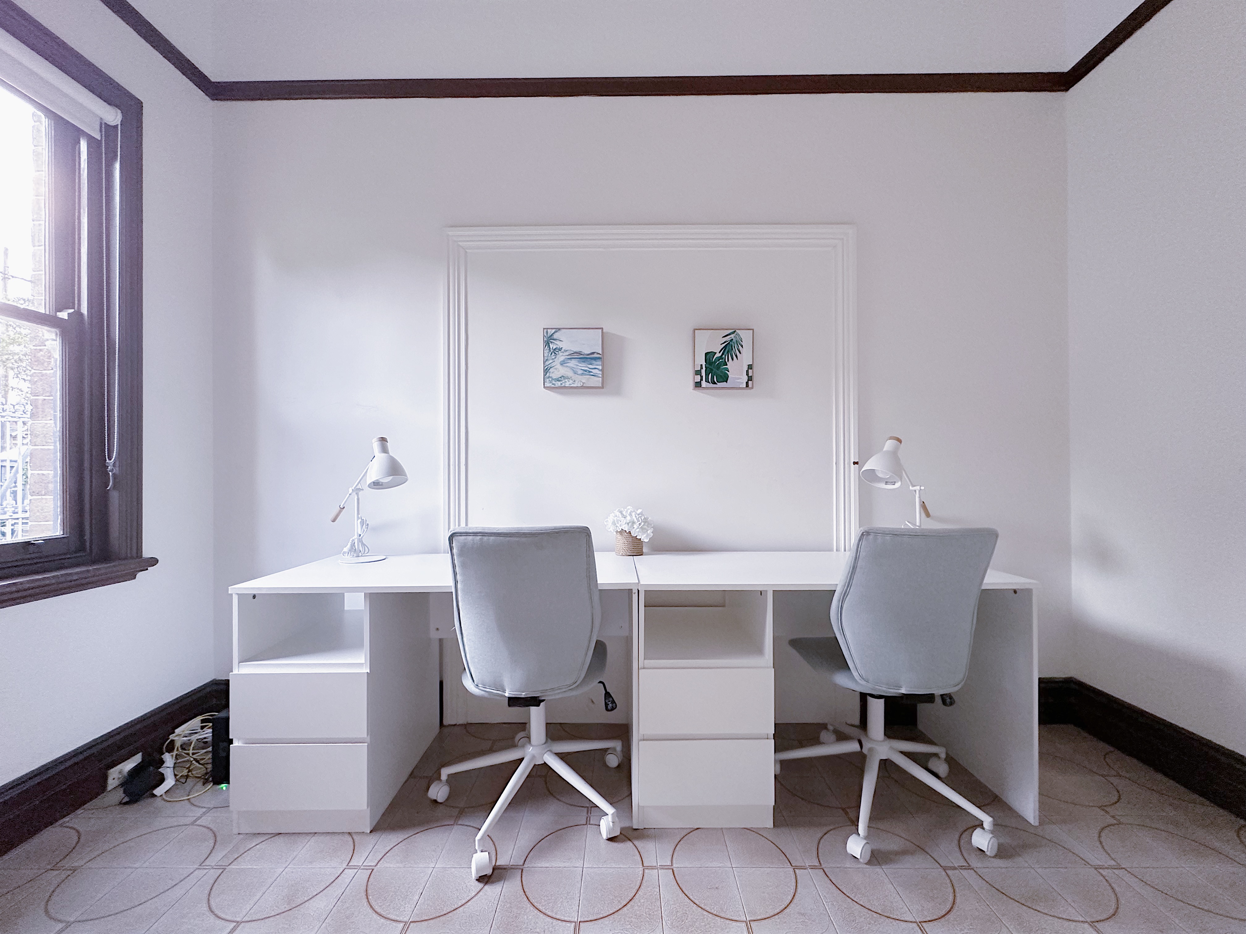 • Two desks and two swivel chairs, facilitating a comfortable workspace for two occupants